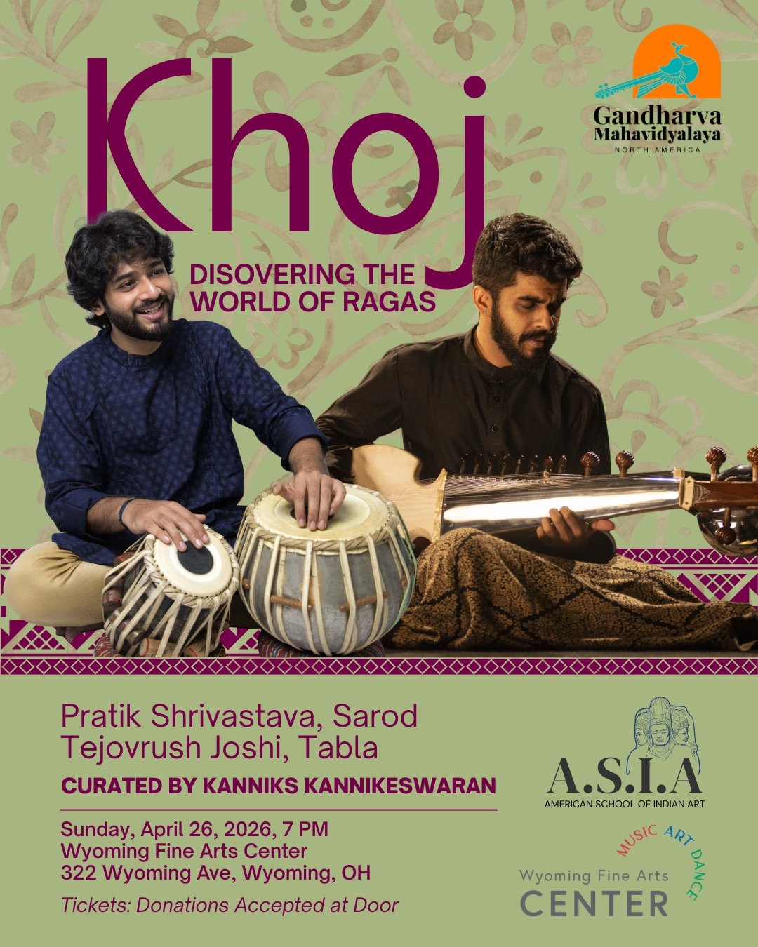 Khoj — the Hindi word for "discovery" — is an interactive concert experience exploring the classical music of North India. Cincinnati-based musician and scholar Dr. Kanniks Kannikeswaran leads the evening alongside Pratik Shrivastava on sarod (a fretless string instrument with a rich, resonant tone) and Tejovrush Joshi on tabla (the paired hand drums at the heart of Indian classical rhythm). The program weaves together live performance, guided listening, and hands-on demonstration — you'll learn what a raga is, how rhythm cycles work, and get a chance to try keeping time yourself. No background in Indian music needed. The format is welcoming and interactive, and kids are encouraged to participate. Come curious.